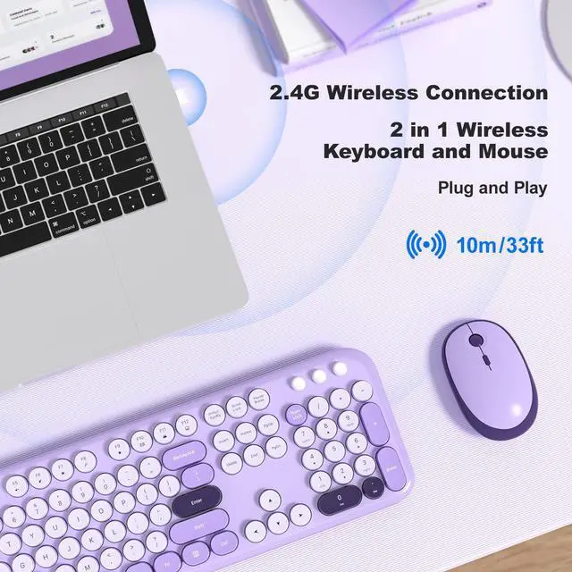 KNOWSQT Wireless Keyboard and Mouse Combo - Lovely Violet Rainbow Full-Sized Typewriter Colorful Keyboards, Round Keycap USB Plug Play Retro Cute Keyboards for Windows, Laptop, PC, Desktop, Computer