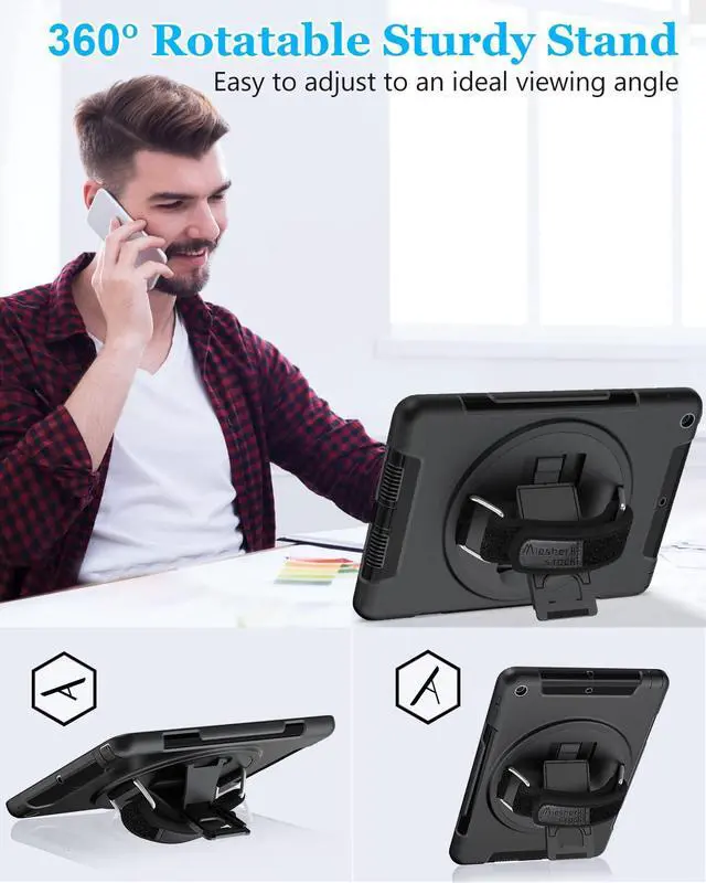 360-DEGREE ROTATING/MULTI-ANGLE STAND: The iPad 9.7 case built-in 360-degree swivel sturdy kickstand that supports multi-angle (Vertical, Horizontal, Halfway between). It can be used to support your iPad while watching a movie, playing games, or typing, let your hands-free. This sturdy kickstand can be folded whe