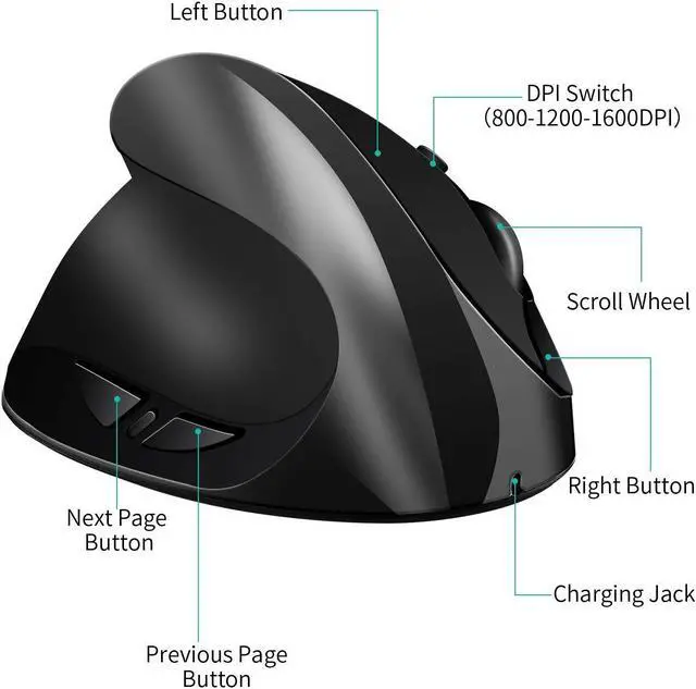 AURTEC Left-Handed Mouse, Rechargeable 2.4G Wireless Ergonomic Vertical Mice with USB Receiver, 6 Buttons and 3 Adjustable DPI 800/1200/1600 for Left Hand, Black