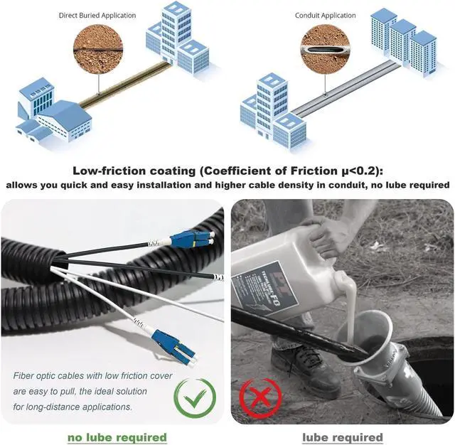 Low Friction LC/PC-LC/PC singlemode duplex fiber optic patch cable: Bangun OS2 fiber patch cable body is made of Ultra Low Friction flame retardant LSZH jacket (Coefficient of Friction <0.2). Low Friction Cables are the ideal solution for wiring premises. The stiffness allows the cable to be installed by pushing as well as by the more conventional pulling method. These cables can even be used in congested conduits.