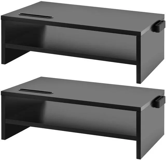 STURY STRUCTURE & THOUGHTFUL DESIGNThis monitor stand is made of MDF, solid wood particle board, durable,safe and beautiful. Comes with 4 rubber pads that make the computer monitor stand more stable, a phone holder slot for putting your phone around, a hub for a cable management and plastic caps to cover screw locks make it look nicer. Supr