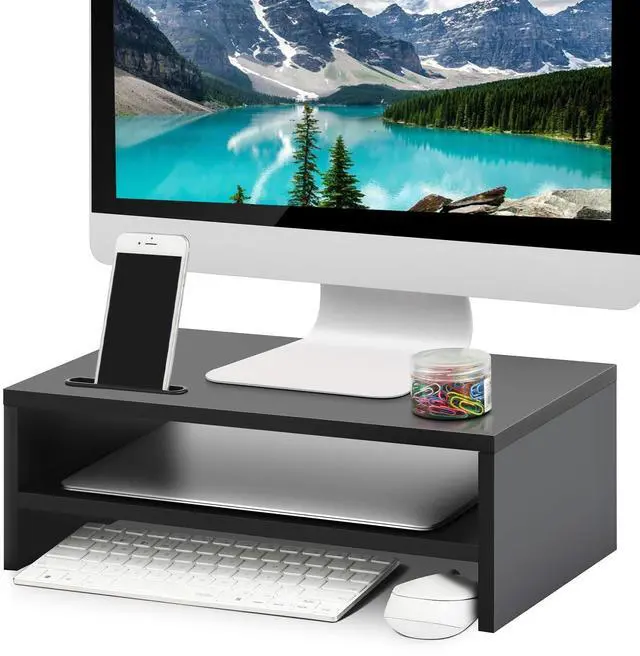 SAVE SPACE, STAY ORGANIZED With 2 tier desktop organizer, maximum holding capacity 66lbs. You could put up your computer monitor on the top and store your keyboard or daily use office supplies underneath bottom shelf, the middle shelf helps organize your laptop and other stuff. Maximum utilize your desktop space, keep your items in order