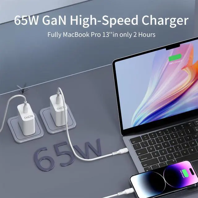 Fast Charging -- CALCINI 65W USB C charger output to power USB PD enabled devices from laptops to tablets to smartphones.Charges your 13-inch MacBook Pro to 100% in just 2.1 hours