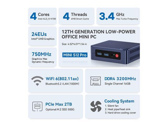 - Efficient Heat Dissipation & Multi-interfacesBeelink MINI S12 Pro built-in fantastic cooling fan, heat sink, and hard drive cooler help cool down the hardware and reduce hardware loss, delivering faster response speed. Mini Computer features a variety of interfaces design (4*USB3.2 Gen2 10Gbps, 2*HDMI 4K 60Hz, 1*RJ45 1000M LAN, 1*Audio Jack, 1*DC Jack), easily meet office business needs, home audio and video needs.