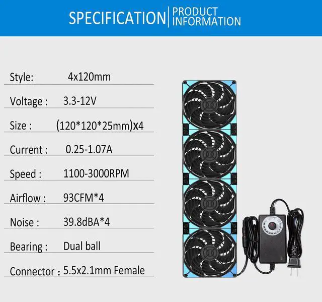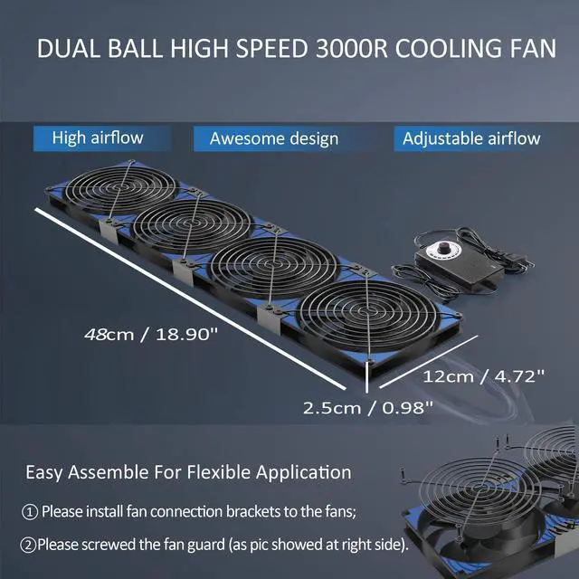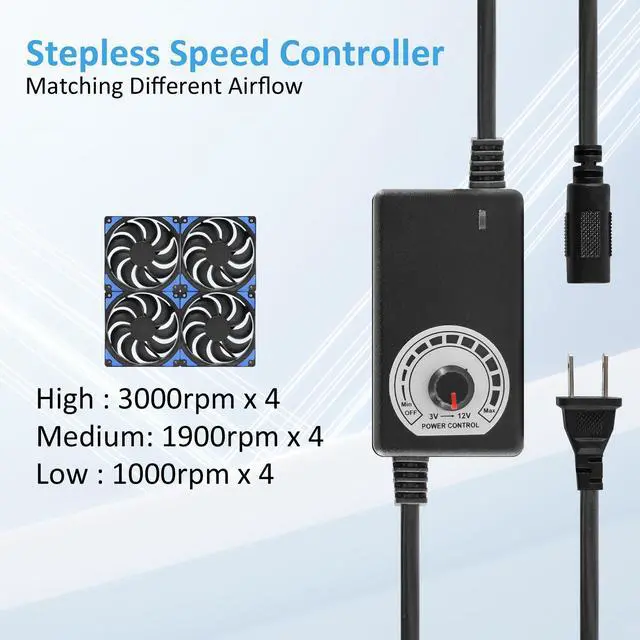 STEPLESS CONTROLLER: Small 120mmx4 computer fans with speed controller,wide range of speed choice,you can easily adjust the speed from silent(1000rpm) to high speed(3000rpm) according to different applications.