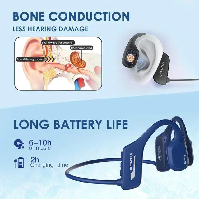 Real Bone ConductionWireless bone conduction headphones with microphone use bone conduction technology to transmit sound through the cheekbone. It is not only safer than in-ear earbuds and over-ear headphones, but also prevents hearing damage.