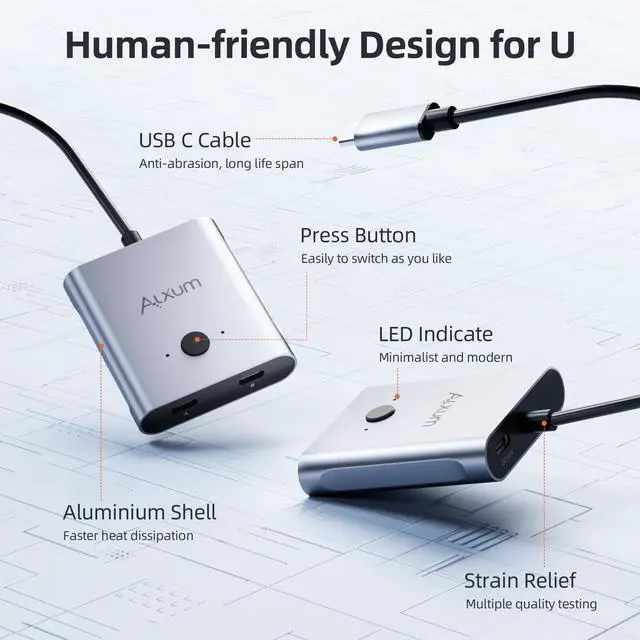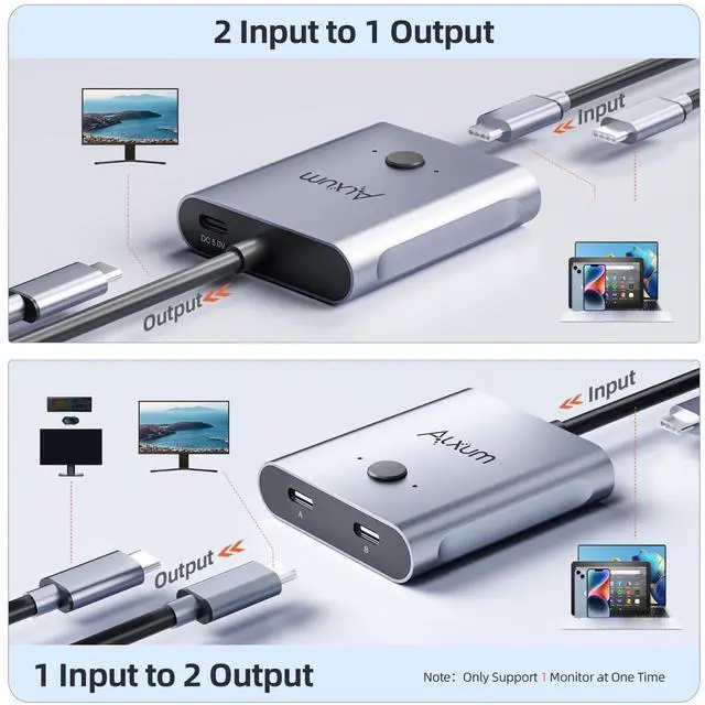 Bidirectional USB C Switch SelectorWith Alxum 2 in 1 out/2 in 1 out USB C switch, 1 5V1A power Adapter, 2 USB C to C Cable 1 m you can easily share one display between two USB-C video sources or share one source between two displays. such as laptops, tablets, mobile phones, game consoles and other full-function USB C devices. NOTE: Two displays CANNOT display simultaneously.