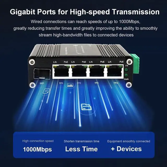 Mini Industrial 4 Port 10/100/1000Mbps Gigabit Ethernet POE + Switch with SFP Port Din Rail/Wall-Mount 4 Port 10/100/1000BASE-T RJ45 + 1 Port 100/1000FX (SFP) Support 12-48V DC