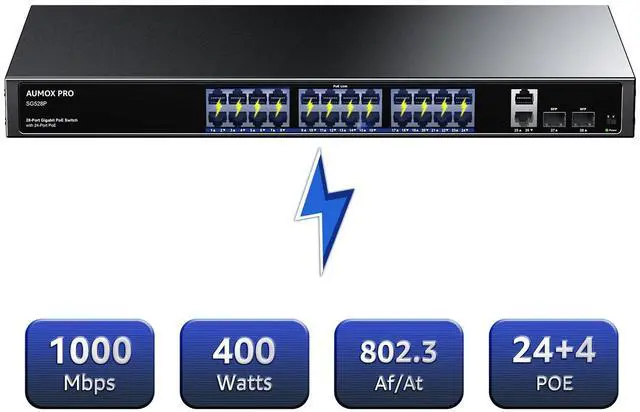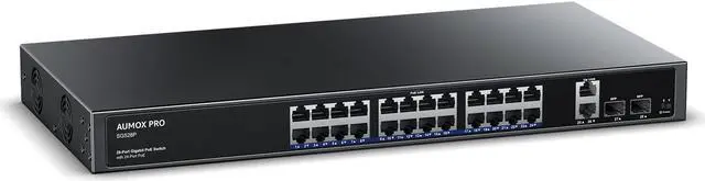 28 Gigabit PortsAUMOX PRO ethernet switch includes 24* 10/100/1000Mbps RJ45 PoE ports with 2 Uplink gigabit ports,2 x 1G SFP Slots. Excellent data transmission performance
