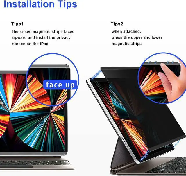 CompatibilityMagnetic Privacy Screen Protector exclusively designed to protect and perfectly fit your Apple iPad Pro 12.9" 5th Gen 2021 Latest Model (A2378 A2461 A2379 A2462), iPad Pro 12.9" 4th Gen 2020 (A2229 A2069 A2232 A2233) and iPad Pro 12.9" 3rd Gen 2018 (A1876 A2014 A1895 A1983).