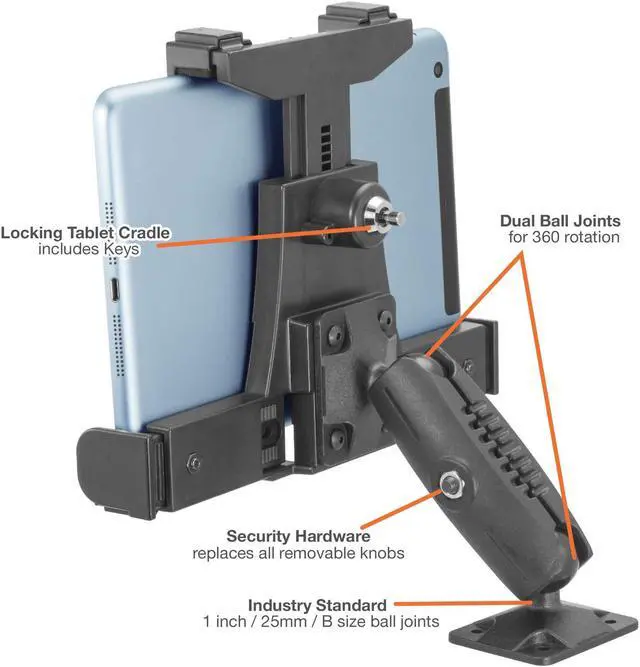 UNIVERSAL TABLET COMPATIBILITY Fits tablets from 7 to 11 and includes a 3.75 pedestal with dual 1-inch (25mm) ball joints compatible with all industry-standard 1-inch / 25mm / B size mounting arms and adapters. Features the 4-hole AMPS pattern with 30mm x 38mm hole spacing for secure and reliable attachment.
