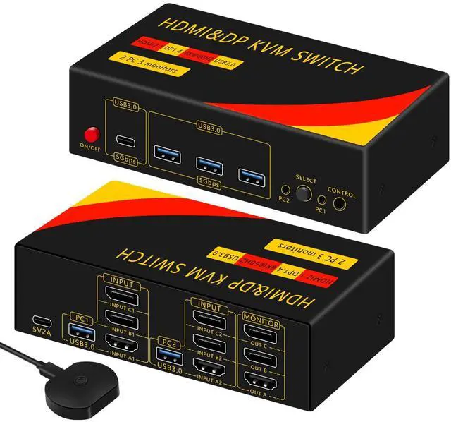 KVM Switch 3 Monitors 2 PCs This 2 PCs 3 Monitors KVM Switch is perfect for connecting 2 desktops/laptops to share a set of USB devices such as a keyboard and mouse, and up to 3 monitors (Extended and Mirrored display modes are supported). Please note: Expanded mode can output three different screens and Mirror mode can output three identical screens. Note: 1*HDMI and 2*DP ports are required for each computer. Please make sure that each of your computers supports 3-screen display when purchasing. Testing method: You can connect your computer directly to 3 monitors (without KVM).