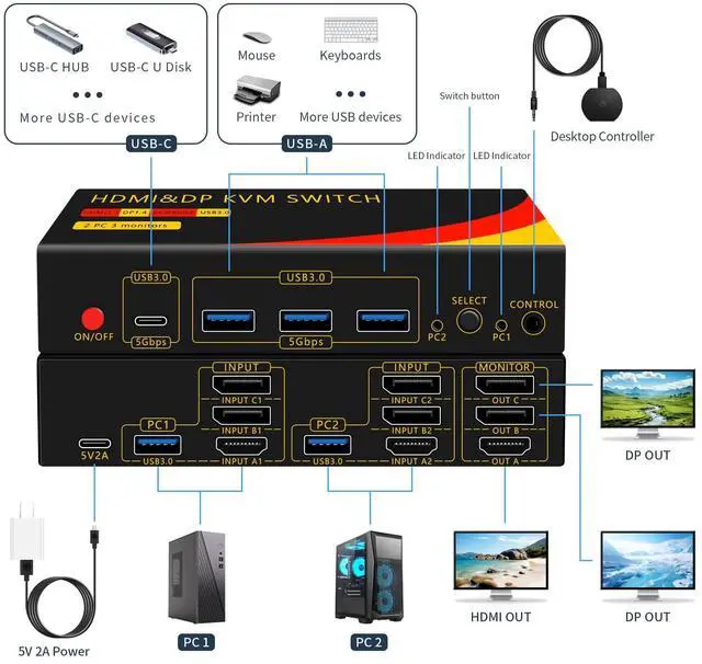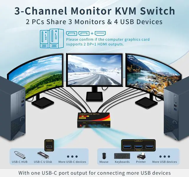 HDMI Displayport KVM Switch with 4 USB 3.0 Ports3-Display KVM Switch with 4 USB 3.0 ports, including 3*USB-A and 1*USB-C, you can connect more USB devices. Support superfast 5Gbps data transfer, you can connect keyboard, mouse, printer, USB camera and other USB devices. Note: Each computer needs to connect a USB cable to the KVM switch.