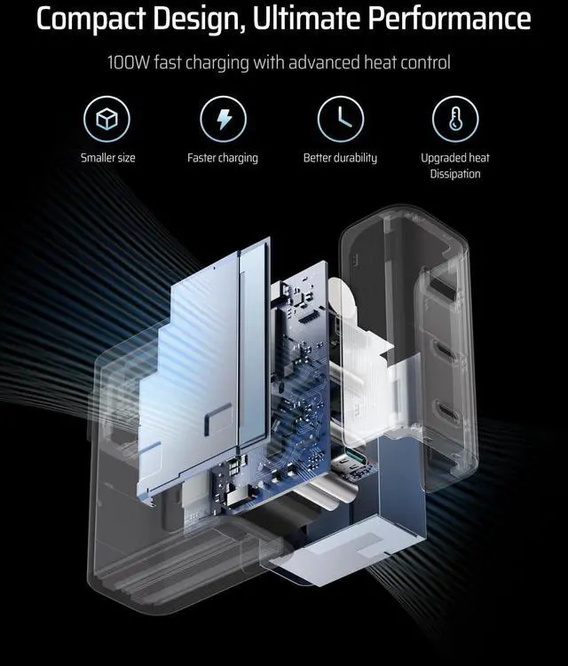 100W Max Power for Speedy ChargingOur charger delivers an impressive 100W of power, making it the perfect companion for quickly juicing up your laptops, smartphones, and other high-power devices. Whether you're in a rush to get to a meeting or simply need a swift recharge during a busy day, this charger ensures your devices are powered up efficiently to keep up with your fast-paced lifestyle.