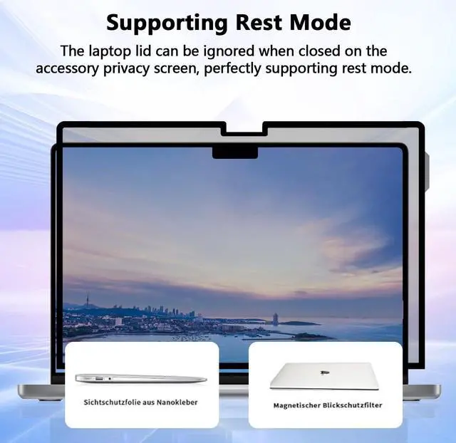 Perfectly closed & ultra-thin: Adopts the latest vacuum nano-adsorption technology. No need for magnetic adsorption and glue adsorption. It's easy to remove and add back. NOTE: This privacy screen (0.25mm thick) is thinner than any screen on the market. As a result, the laptop lid can be ignored when closed on the accessory privacy screen, perfectly supporting rest mode.