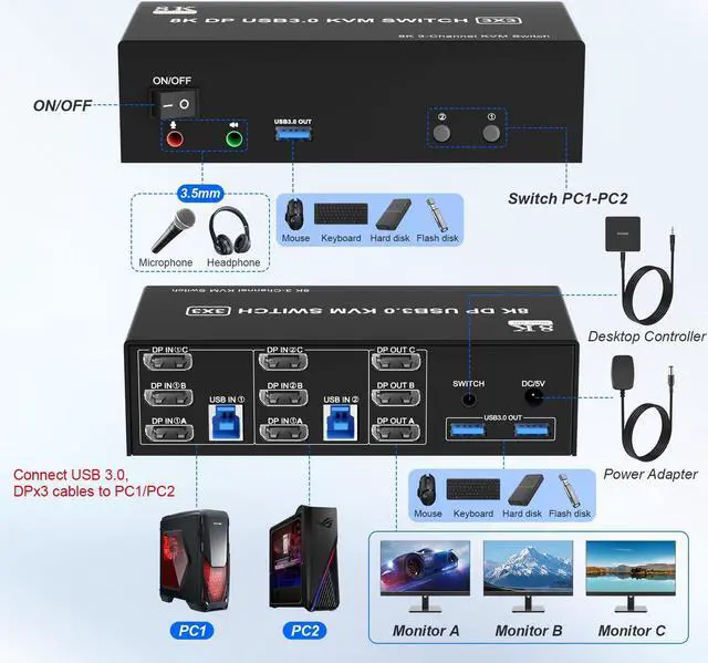 KVM Switch 3 Monitors 2 Computers: KVM Switch 3 Monitors allow 2 computers to share 3 Displayport monitors and 3 USB 3.0 ports,You only need one set of keyboard and mouse to control all the monitors, and it supports splicing, extend and mirror displays mode. Splicing Mode: Computer host outputs splice screens on 3 monitors. Extended Mode: PC host in output 3 different images on 3 monitors. Copy Mode: Computer host outputs 3 identical images on 3 monitors. (Note: Please make sure your computer supports multi-display and each connected computer requires 3 DP ports)