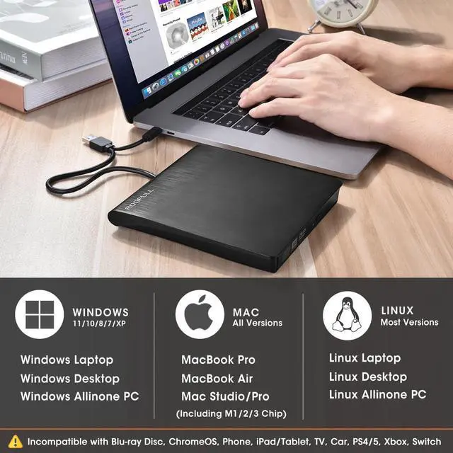 Best External CD/DVD Drive for Laptop MacConsidering that most of the latest laptop and desktop PCs are not equipped with an internal CD/DVD drive. This ROOFULL USB 3.0 external CD/DVD drive is a perfect solution for most computers to read and write CDs and DVDs. Just plug the data cable into your computer's USB-A or USB-C port, and insert your CDs or DVDs, it will install the driver and be recognized automatically, you can then use the corresponding software to read and write your discs, no complex settings, plug and play! (Scroll down to see detailed steps and recommended software)
