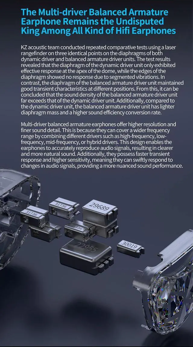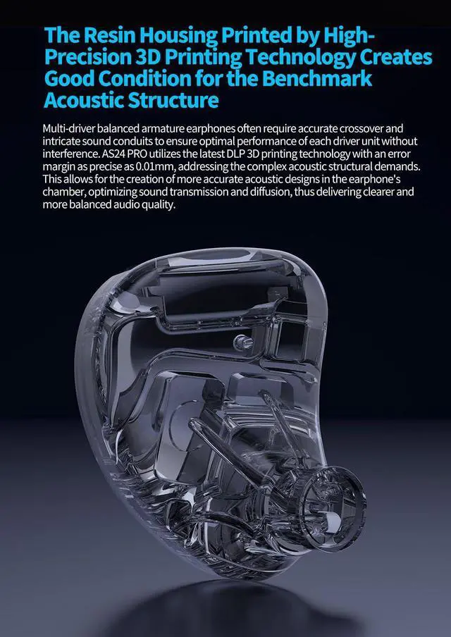 New Acoustic Structure of KZ AS24 PRO:KZ AS24 PRO utilizes exclusively developed BAdrivers, distinguishing itself from commonlyfound drivers in the market. This uniquenes s makes the AS24 PRO a masterpiece that'sdifficult to replicate. The king-grade BA matrix combination ensures that AS24 PRO coversthe entire audio spectrum from low to high frequencies.When playing cymbals, violins, drums, and bass, a relatively perfect musical presentation can be achieved