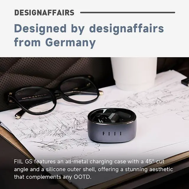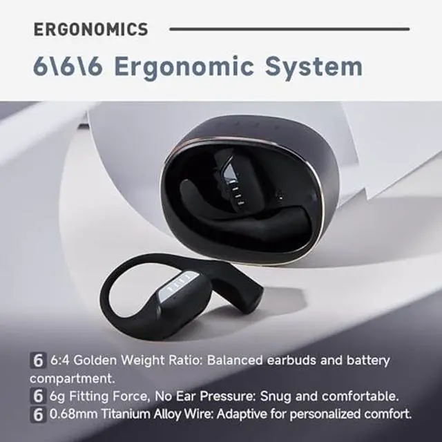 Ergonomic Systematic Design, all-day comfort -6:4 Weight Ratio: the earbuds and charging case weight are in a 6:4 golden ratio. -6g Fitting Force, No Ear Pressure: the GS's 6g average fitting force design ensures a secure fit without pressure on the ears. -FIIL GS open ear wireless headphones adopts a 0.68mm ultra-fine titanium alloy wire flexible material, making each contact with the ea