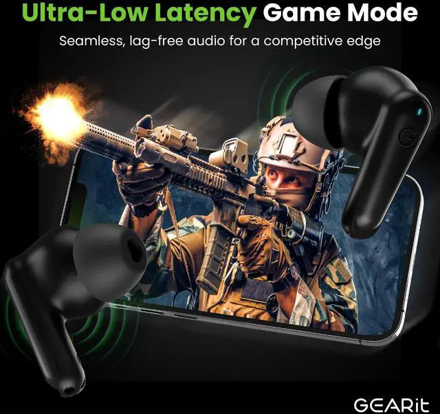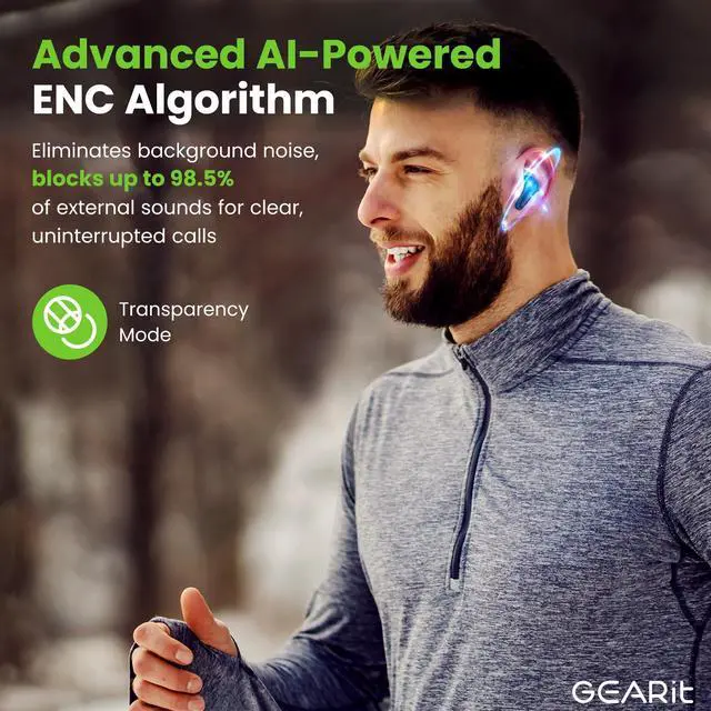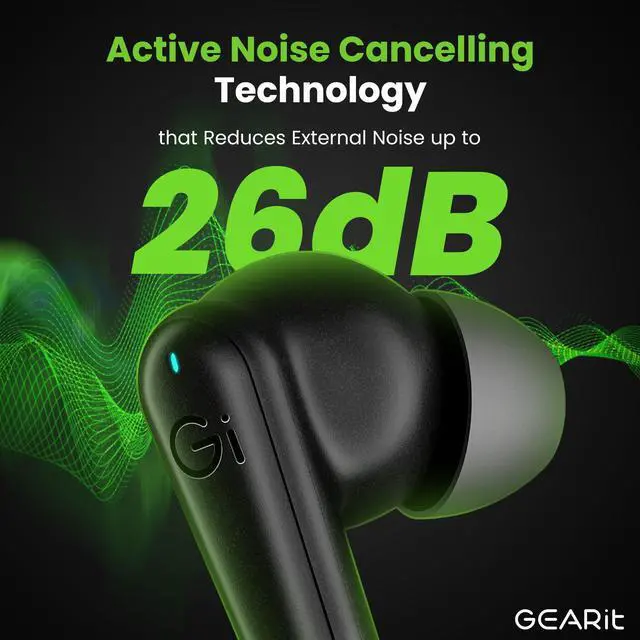 Active Noise Cancellation (ANC): GEARit true wireless earbuds, compatible with iPhone/Android, use ANC technology to reduce external noise, blocking 98.5% of distractions.