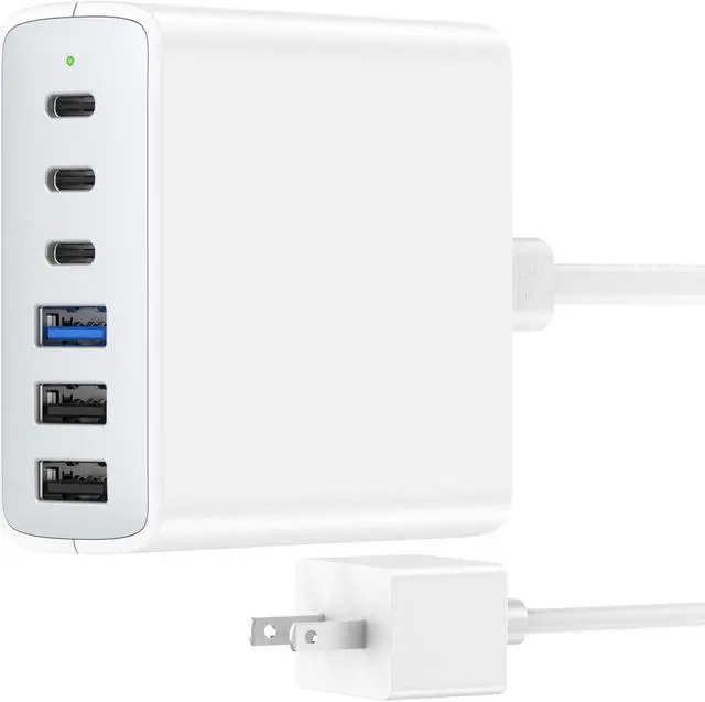 100W 6 Port Charger- 6 in 1 100W Desktop Charging Station: Equipped with 3 USB-C ports and 3 USB-A ports: USB C1: PPS 25W, USB C2: PD 20W, USB C3: PD 20W, USB A1: QC 18W, USB A2/A3 share 12W, and max 12W while single port charging. Fast charging six of your devices simultaneously instead of taking up 6 wall outlets. 5FT Extended power cord is convenient for home or office