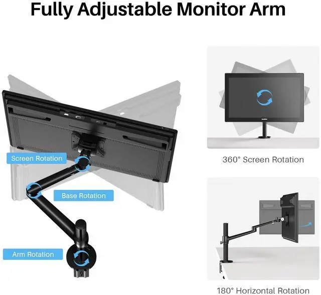 HUION Single Monitor Arm, VESA Desk Monitor Mount for Monitors Up to 32 Inches and 17.6 lbs, Heavy Duty Fully Adjustable Stand, Computer Monitor Arms with Clamp/Grommet Mounting Base