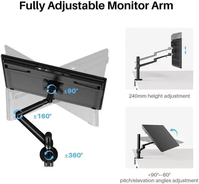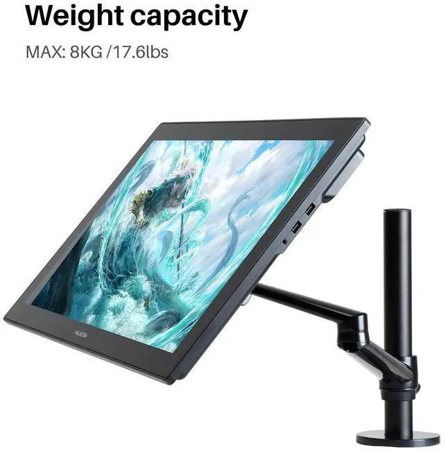 360-degree screen rotation and 180-degree horizontal rotation lets you find your best view for each project. Works with almost any LCD monitor up to 32 inches and up to 17.6 pounds, such as Huion Kamvas 24 , Kamvas 24 Plus, Kamvas Pro 24 4K, etc.
