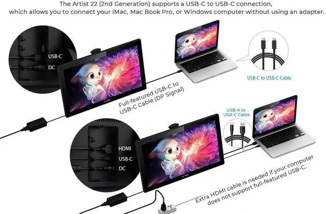 [Easy Cable Connection] - XP-PEN drawing tablet can be easily connected with the full-features USB-C cable(sold separately), bringing you a clean and tidy desk. You can easily connect your laptop that supports Type-C input to XP-PEN 22 2nd with only one cable. For a computer without USB-C Port, use the 3-in-1 cable included in the box.