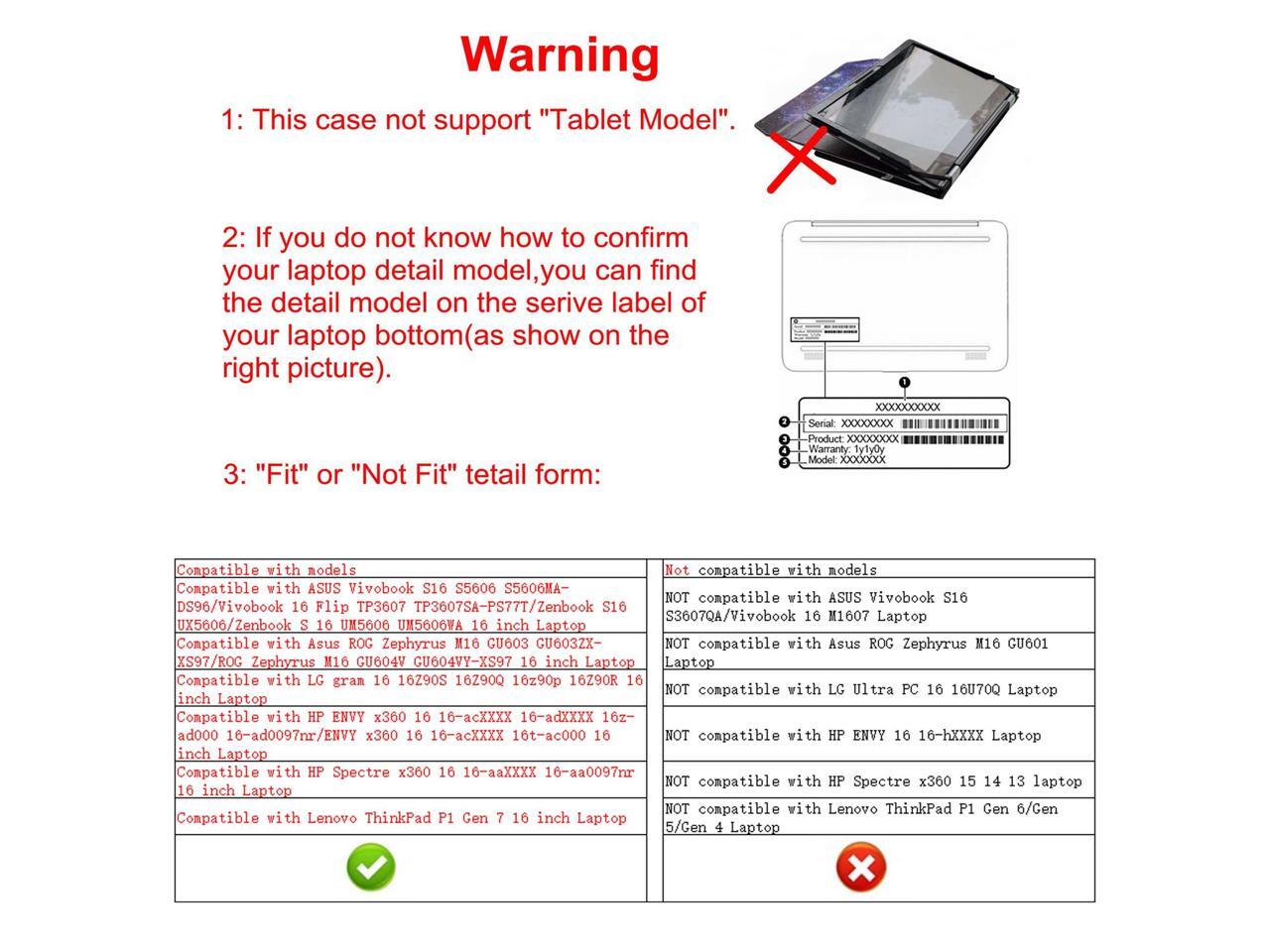 It is especially designed for HP OmniBook X Flip 16 16-arXXXX 16-ar0087nr/OmniBook X Flip 16 16-asXXXX 16-as0023dx/OmniBook 7 Flip 16 16-auXXXX 16-au0000nr,Case for HP ENVY x360 16 16-acXXXX 16-adXXXX 16z-ad000 16-ad0097nr/ENVY x360 16 16-acXXXX 16t-ac000,Case for HP Spectre x360 16 16-aaXXXX 16-aa0097nr,Case for ASUS Vivobook S16 S5606 S5606MA-DS96/Vivobook 16 Flip TP3607 TP3607SA-PS77T/Zenbook S16 UX5606,Case for Acer Swift Go 16 SFG16-72T SFG16-71/Swift Edge SFA16-41 SFE16-42