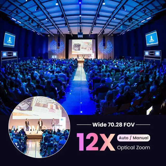 4K UHD 12X Optical ZoomThe camera features a CMOS sensor that delivers true 4K Ultra HD clarity, ensuring smooth and lifelike imaging. Its 12x optical zoom lens with fast auto-focus captures every detail with precision, keeping subjects sharp and clear at all times. Silent PTZ (horizontal: ±175°, vertical: ±90°), you can use infrared remote control or speaker to control the PTZ rotation, making your meeting easier.
