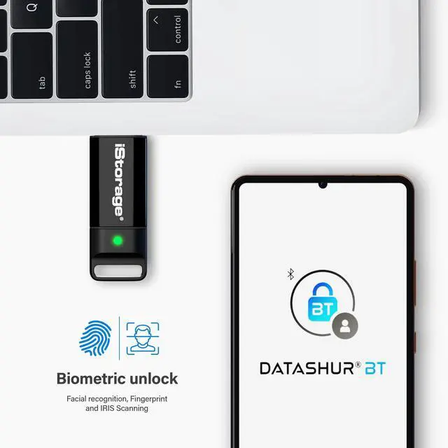 Lock and unlock from the datAshur BT Personal app on your mobile device using a 7-15-character password or simply use biometric unlock (Face ID/Facial recognition, Touch ID/Fingerprint and IRIS scanning)