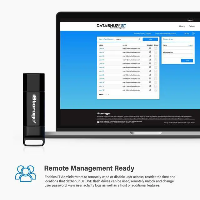 Remote management ready via the iStorage Remote Management Console (optional). datAshur BT drives can