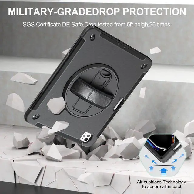 Miesherk Case for iPad Pro 13 Inch, Military Grade Heavy Duty Shockproof iPad 13 M4 Case (2024, 7th Generation) - Screen Protector, Rotating Stand, Pencil Holder, Hand/Shoulder Strap, Black