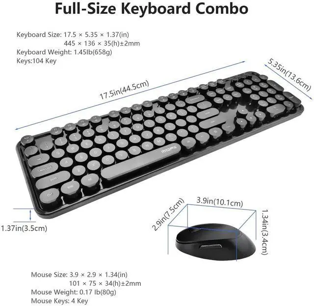 STIVIC Wireless Keyboard and Mouse Combo, Retro typewriter Style Keyboard with Round Keycaps, 2.4GH z Dropout-Free Connection Mouse with 3 Adjustable DPI for Windows Notebook PC