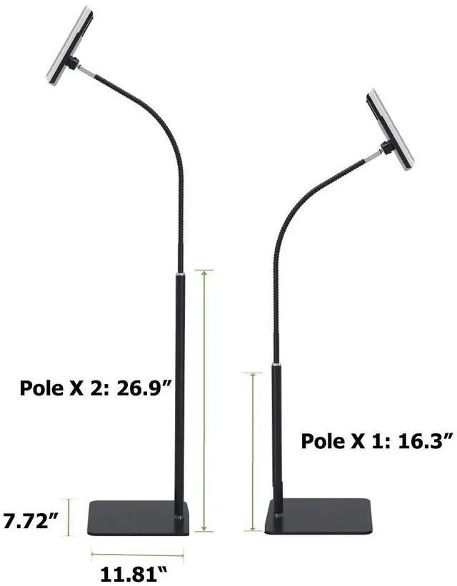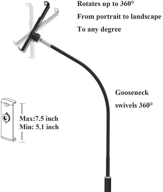 The floor tablet stand features a gooseneck hose, allowing for greater flexibility both indoors and outdoors. This stand is ideal for use in drawing rooms, sofas, bedrooms, home gyms and more.