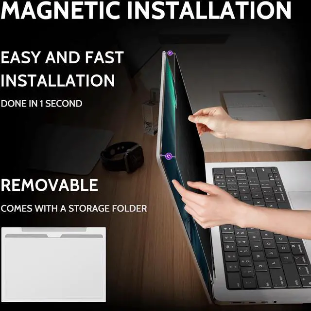SUPER EASY INSTALLATIONPeslv has designed an innovative magnetic mounting method in order to improve the installation of the MacBook privacy screen. The top of the MacBook Air privacy screen has a reinforced magnetic strip, which can be installed in a second by simply aligning it with the top bezel of the screen and gently pressing it. With Peslv privacy screen MacBook Pro 13 inch, you'll never be stuck in an awkward situation where you don't know how to install it!