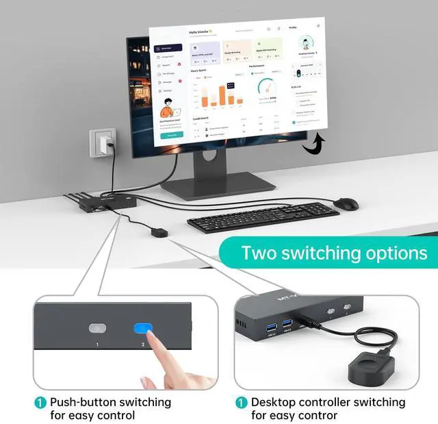 KVM Switch Displayport with 4 USB 3.0 Ports: This KVM DP 8K has 4 USB 3.0 ports for sharing USB flash drives, printers, mobile hard drives, U disk, and other USB 2.0 and USB 3.0 devices. USB 3.0 offers data transfer speeds up to 5Gbps, while USB 2.0 is only 480Mbps. NOTE: Please Ensure USB C Charging to the power source when connecting high-power equipment suc