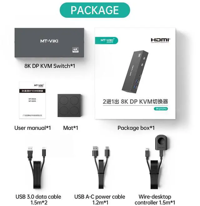 MT-VIKI 8K Displayport KVM Switch 2 in 1 Out DP1.4 with 4 USB 3.0 Ports, Support 8K@60Hz 4K@144Hz Share 1 Monitor Keyboard Mouse U-Disk Printer, with 2 USB A to C Cables