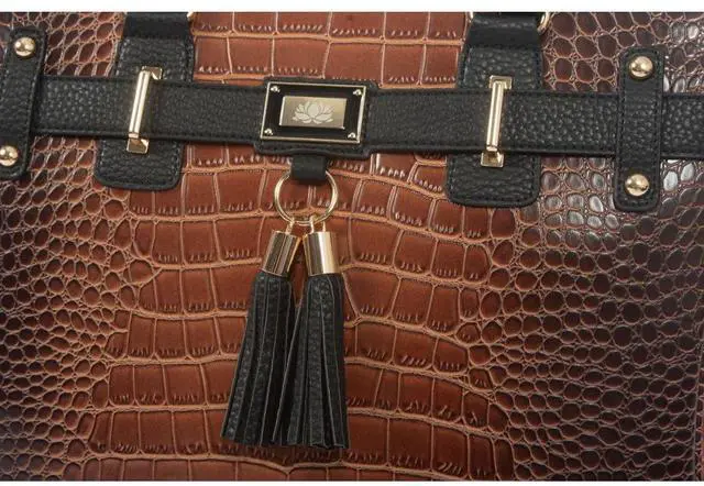 • Chic brown alligator-textured and black trim faux leathers exterior adds a touch of luxury to your professional ensemble. Alligator/crocodile patterns may vary from bag to bag. Please note our new Manhattan bag now has alligator pattern piping.