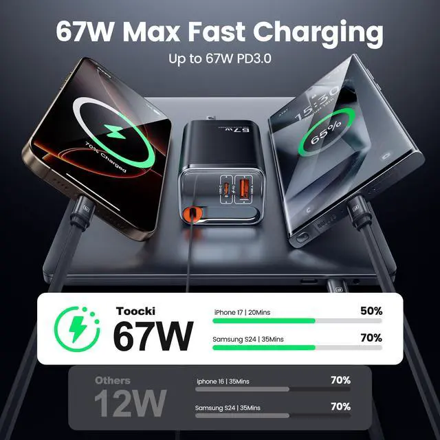 67W GaN Fast ChargingThis 3 in 1 GaN charger supports up to 67W output power through the USB-C port, 30W through the USB port, and up to 60W charging through the Type-C retractable cable, allowing you to charge three devices simultaneously. Compatible with iPhone 17/16/15/14/13/12 series, Samsung Galaxy S25/S24/S23/Ultra, MacBook Air/Pro, Lenovo, Dell, iPad, and more