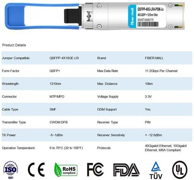 40GBASE-PLR4 Compliant with QSFP+ MSA and IEEE 802.3ba 40GBASE-LR4, standard.Digital diagnostics functions are also available via the I2C interface, compatible for Juniper ecoding as JNP-QSFP-4X10GE-LR also