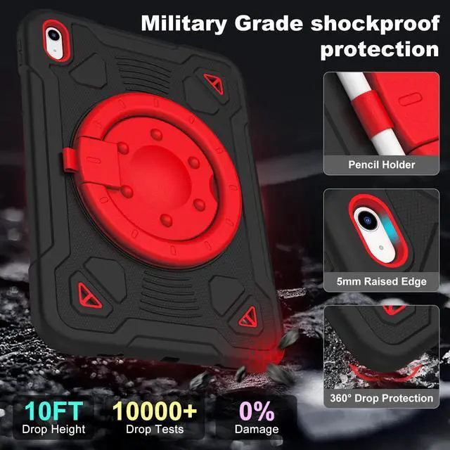 Hogenl for iPad A16 Case 11th Generation 11 inch 2025 /iPad 10th Generation Case for Kids 10.9" 2022 with Screen Protector/ 360° Rotating Stand/Shoulder Strap/Pencil Holder Rugged Cover (Black Red)