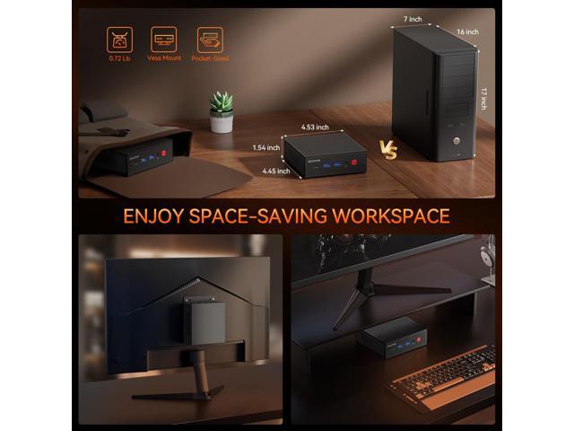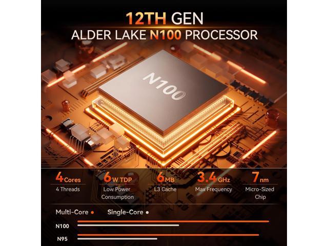 - Powerful Mini PC & Compact DesignThe mini computer is equipped with the 12th Twin Lake N100 processor (up to 3.4GHz, 4 cores/4 threads, 6MB L3 cache, and 6W TDP. The micro pc delivers more performance than the N95,ensuring smooth multitasking. Small Yet Efficient, only 4.41*4.41*1.54 in/0.72 Lb, frees up your desktop space. Ideal for routine tasks, home entertainment/home theater, streaming video, web browsing, light office work, TV watching, light video editing, school use, light gaming