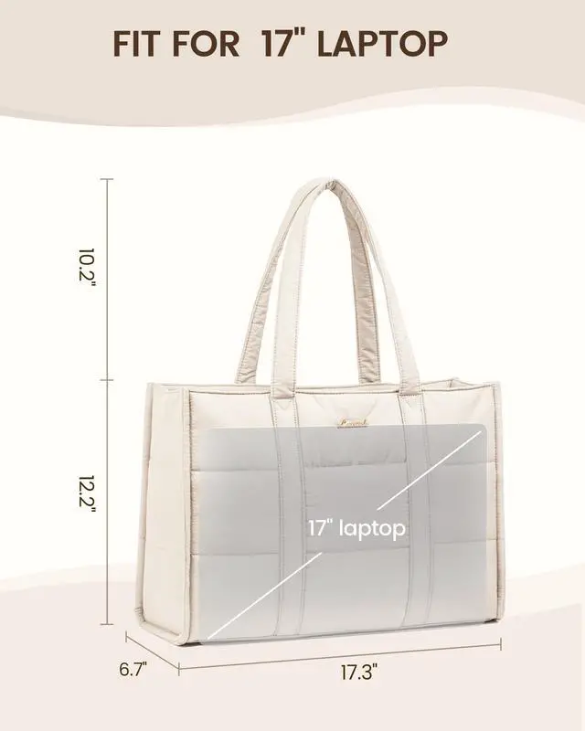 Suitable Size for Everyday LifeMeasuring 17.3" L x 6.7" W x 12.2" H, this puffy laptop tote holds your daily essentials, including 17" laptop, 12.9" iPad, makeup, phone, glasses, charger, tissues, water bottle