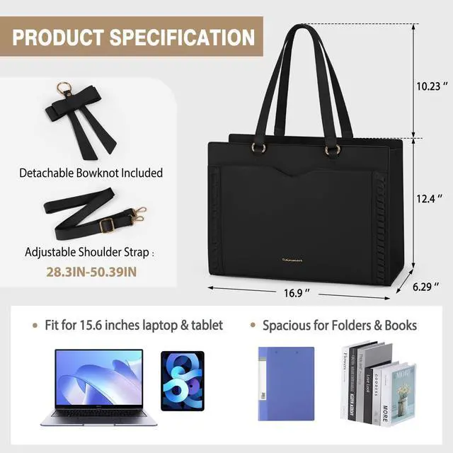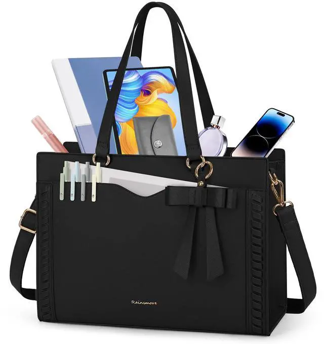 RAINSMORE Laptop Bag for Women 15.6 Inch Work Tote Bag with Detachable Strap & Bow Leather Professional Laptop Tote with Cup Holder, Office Business Briefcase Large HandbagAll Black