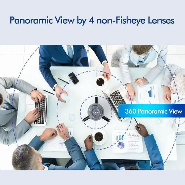 Intelligent Three Non-Fisheye Lens: Featuring three 2MP lenses and real-time in-chip intelligent stitching to produce 1080P Full HD video with a distortion-free view, offering a natural human eye conference room camera experience.