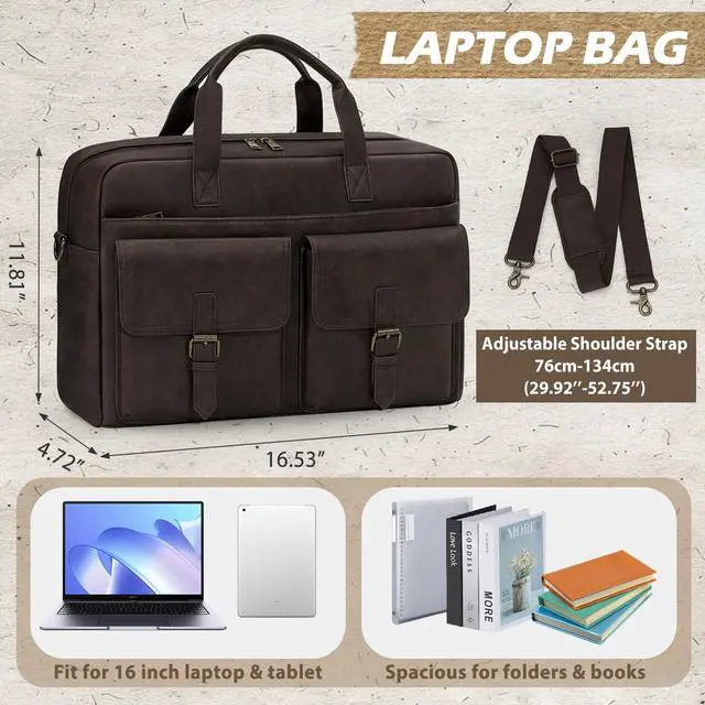 16 INCH LEATHER LAPTOP BAG - The laptop bag sizes in 42cm/16.53in×12cm/4.72in×30cm/11.81in. Weight:1.05kg/2.31lb. Roomy main compartment fits a 16 inch laptop, tablet, files, documents, and books with ease. Appropriate size and lightweight make the messenger bag as a perfect companion for business trips, office commutes, and client meetings. The timeless leather of it elevates your professional look.