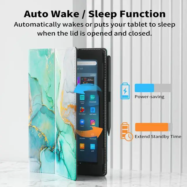 [Auto Wake/Sleep]: Kindle Fire HD 10 case automatically wakes your Fire HD 10 tablet when opened and puts it to sleep when closed. And the magnetic closure and elastic band keep the cover securely closed, protecting your device from dropping out