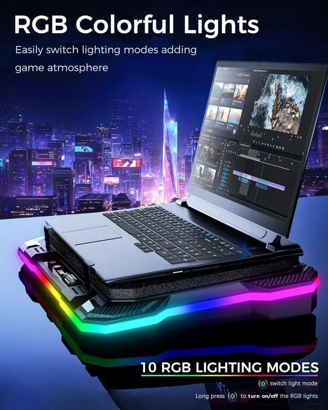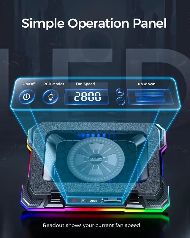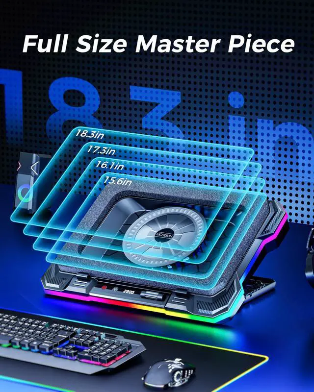 K1 12V: With 10 adjustable modes, the laptop fan cooling pad allows you to set a gamer atmosphere when gaming with your team. The Laptop cooling stand measures 16.85" x 12.44" x 2.3" and is compatible with 14-19 inch laptops with magnetic memory foam for a secure fit. At the front of the laptop stand with fan, a control panel makes it easy to adjust fan airflow, RGB lights setting