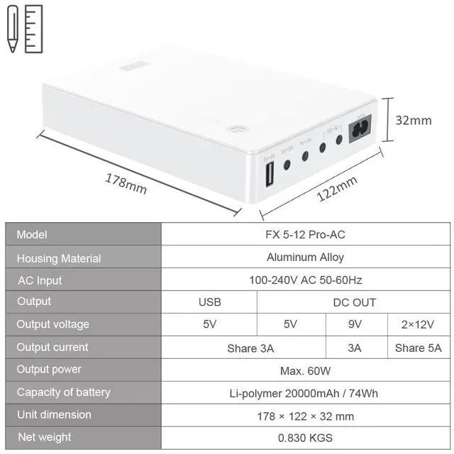 Alumimum alloy housing, Output maximum 60W, 1×5V USB, 1×5V DC, 1×9V DC, 2×12V DC, can support router and modem at the same time.